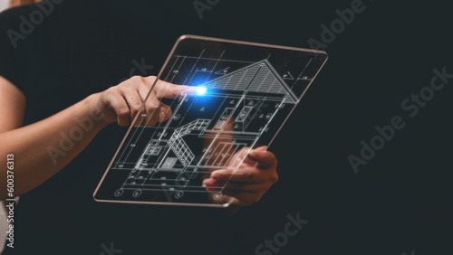 Architect showing new house project on the futuristic virtual interface screen