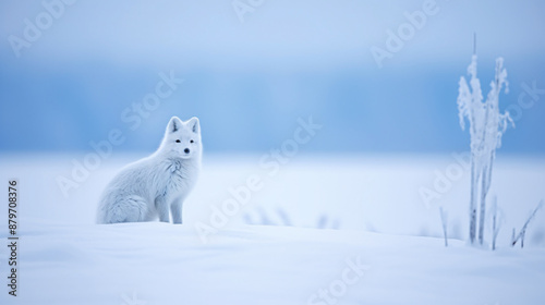 Arctic fox sits in a snowy landscape.