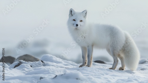 Arctic fox standing on a snowy tundra, its thick white fur blending into the icy surroundings, cold wind swirling around.