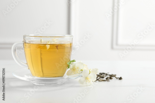 Aromatic jasmine tea in cup, flowers and dry leaves on white marble table
