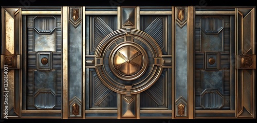 Art deco-style ceiling with symmetrical metallic patterns and a central geometric chandelier, isolated background