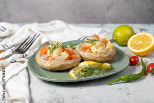 Artichoke with vegetables on gray floor. Artichoke dinner made with olive oil, potatoes, carrots and onions. Healthy food