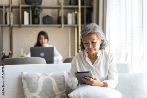 Asian senior woman using tablet for reading news, social media browsing, streaming movies and exploring health articles, modern technology for elderly lifestyle active aging with digital devices