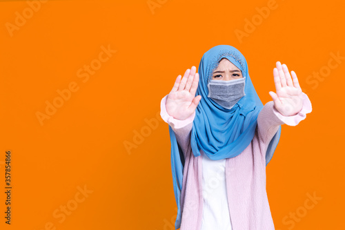 Asian serious muslim woman wears hijab, makes cross with hands over chest, shows stop or prohibition gesture, disagrees with uninteresting offer, isolated over blue background. No sign