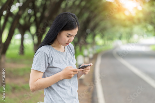 Asian young woman looking smartphone and worry beside the road