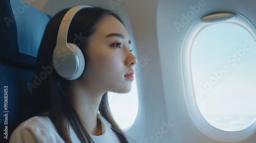 Asian young woman wearing headphone listen to music at first class on airplane during flight Traveling and Business concept : Generative AI