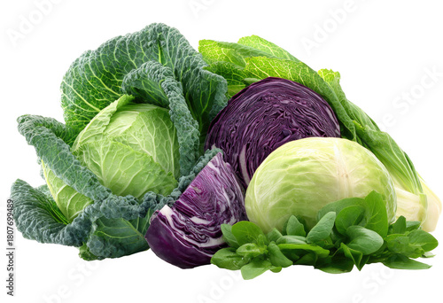 Assorted cabbages, green, red, and savoy, with fresh leaves