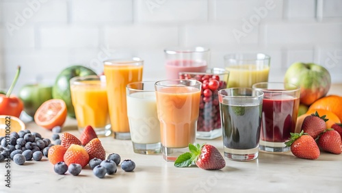 Assorted Fresh Fruit Juices in Glasses with Berries and Citrus on Table