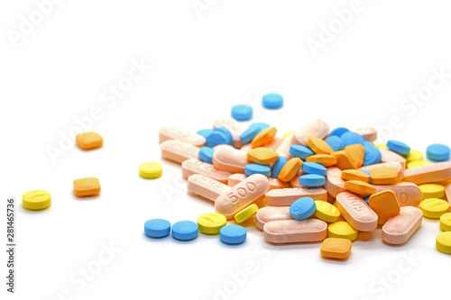 Assorted pharmaceutical medicines for healthy, isolated on white background.