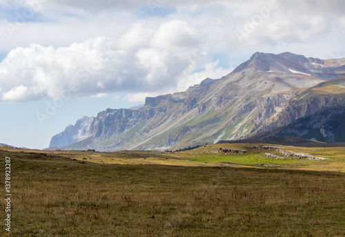 autumn in the mountains, yellowing landscape in nature, views of the area, walking along a dirt trail