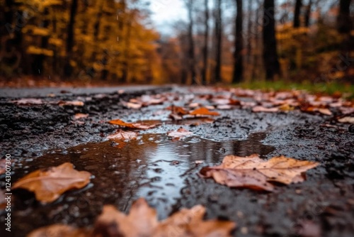 Autumnal Puddle Reflections: A Serene Forest Road in the Fall
