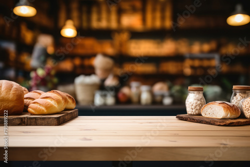 Bakery products, bread and ingredients on wooden table in supermarket. Template for product display. World Bread Day.