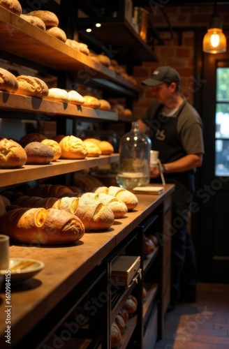 bakery with freshly baked artisan bread on wooden shelves. cozy atmosphere with baker working in background. rustic bread shop, culinary, cafe interior. food, restaurant brochure, menu design