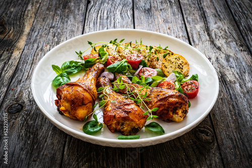 Barbecue chicken drumsticks with fried potato, lettuce and mini tomatoes on wooden table