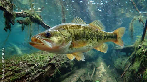Bass swimming alongside a submerged tree stump in a natural habitat
