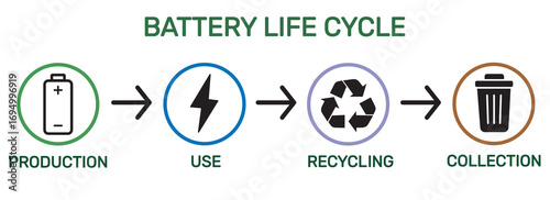 Battery life cycle. Infographic of battery production, use, collection and recycling process, eco energy concept