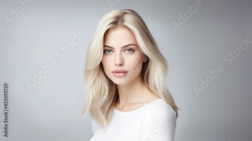 Beautiful blonde white woman gorgeous looking at camera on white background advertising skincare spa treatment. Mid age tightening face skin care rejuvenation cosmetics concept. Generative AI