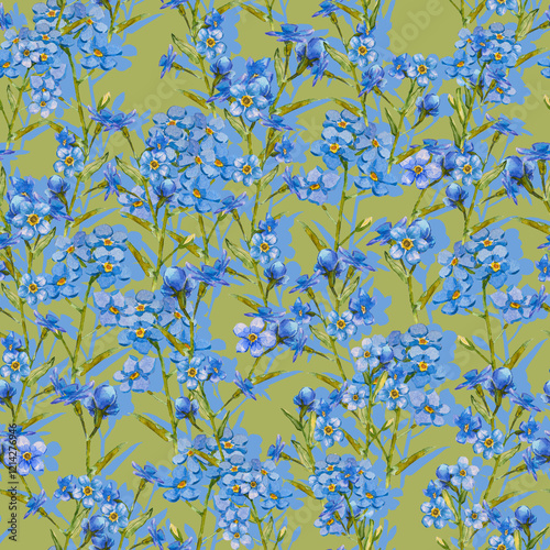 Beautiful blue forget-me-nots flowers seamless pattern. Blue wildflowers background. Watercolor hand painting illustration