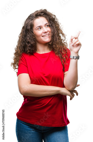 Beautiful brunette curly hair young girl wearing casual look over isolated background with a big smile on face, pointing with hand and finger to the side looking at the camera.