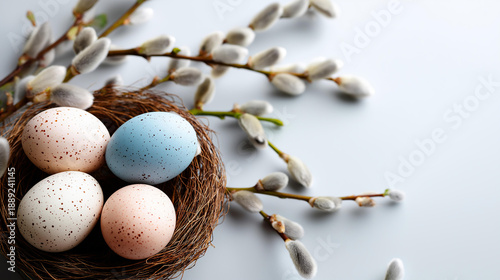 Beautiful easter eggs and pussy willow branches on light background with space for text spring holiday decoration festive natural display with copy space