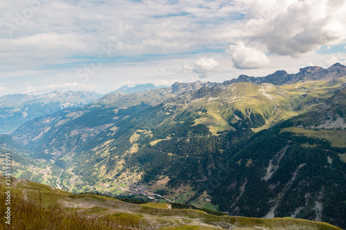 Beautiful high angle view on the Anniviers valley with some picturesque alpine villages seen from top of Sorebois on a cloudy summer day. Zinal, Val d' Anniviers, Switzerland