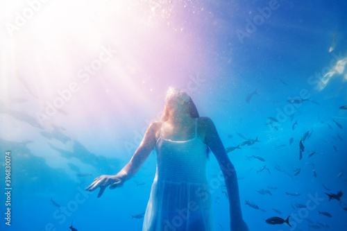 Beautiful little girl swim with fish school wearing dress view from bellow over sunny water surface