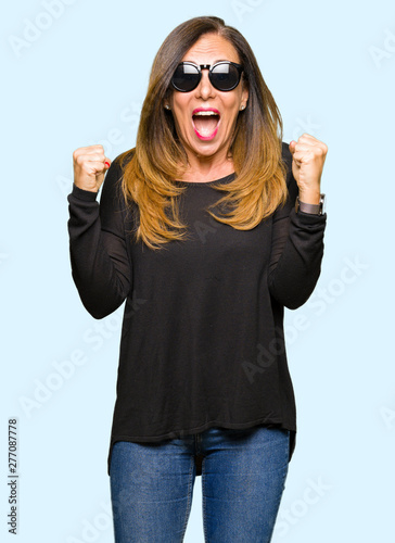 Beautiful middle age woman wearing sunglasses celebrating surprised and amazed for success with arms raised and open eyes. Winner concept.