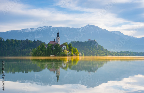 Beautiful morning at Lake Bled and Julian Alps in the background. The lake island and charming little church dedicated to the Assumption of Mary are famous tourist attraction in Slovenia