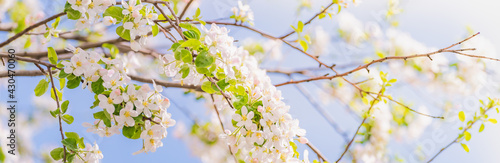 Beautiful panoramic scenery with spring flowers, green leaves and bokeh background