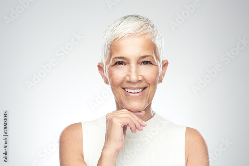 Beautiful smiling senior woman with short gray hair posing in front of gray background. Beauty photography.