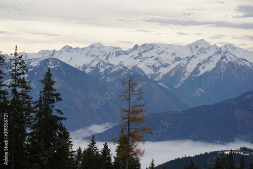 beautiful view in the morning to the snow capped alps in austria in autumn