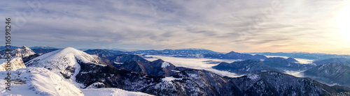 Beautiful winter panorama in Winter Mountains. Landscape with spruce trees in Mountains , blue sky . Slovakia Mala Fatra