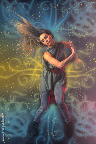 Beautiful woman dancer dancing over dark background with light r