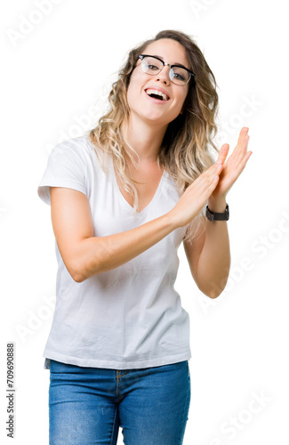 Beautiful young blonde woman wearing glasses over isolated background Clapping and applauding happy and joyful, smiling proud hands together