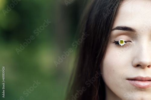 Beautiful young woman covering eye with daisy flower on nature background. Natural beauty, natural cosmetics, skin care.