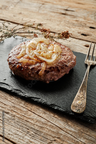 Beef Burger Topped With Onions Served on a Black Plate on a Wooden Table