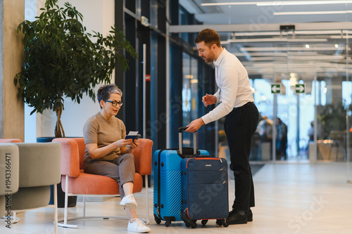 Bellboy assisting senior woman with luggage at hotel