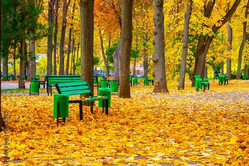 Bench in autumn park. Autumn landscape.