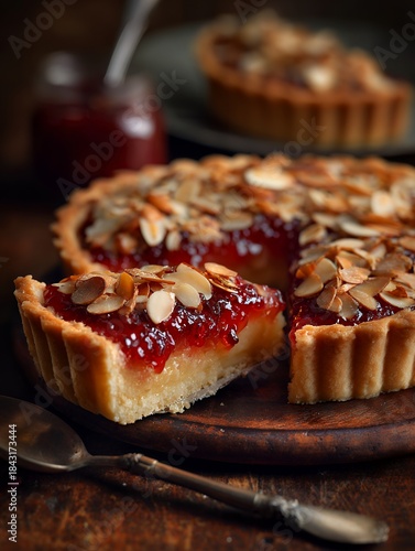 Berry Tart Delight: A close-up showcases a delectable berry tart, boasting a buttery crust and a vibrant berry filling, complemented by toasted almonds and served with a side of preserve.