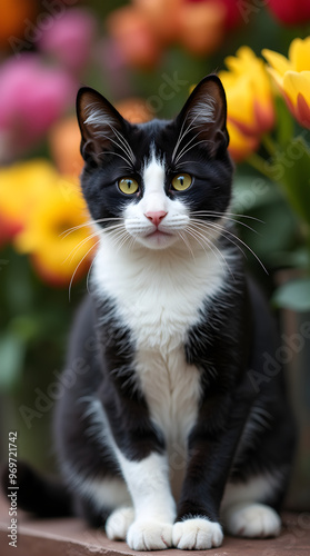 Black and White Cat with Colorful Flowers in the Background