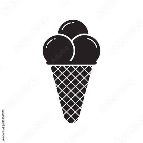 Black and white illustration of ice cream cone with three scoops of ice cream in a waffle cone on a white background simple graphic design element