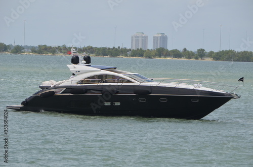 Black and white motor yacht on Biscayne Bay off of Miami Beach,Florida
