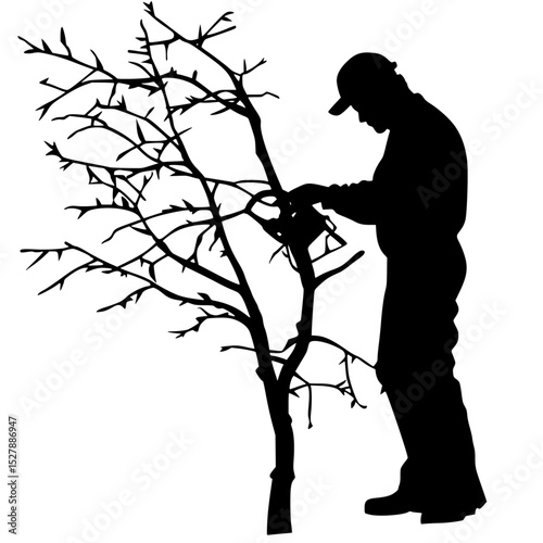 black and white silhouette of a man cutting a tree black, branch, cut, man, silhouette, tree , Generative art.