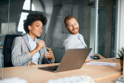 Black businesswoman talks to colleague while working on laptop in office.