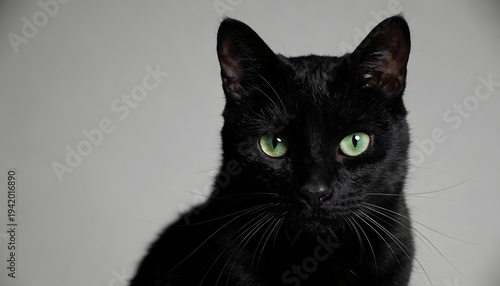 Black cat with bright green eyes looks forward against solid gray background