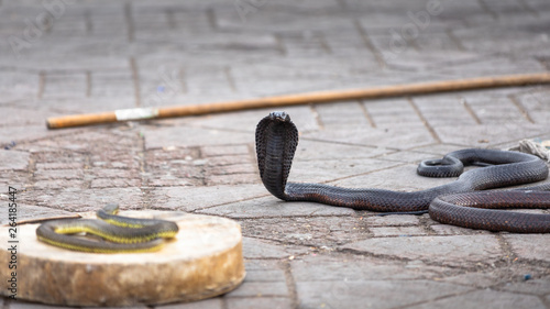 Black cobra entertaining the crowds in Jemaa El Fnaa square in Marrakesh, Morocco