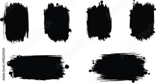 Black ink brush stroke splatters and shapes on white background