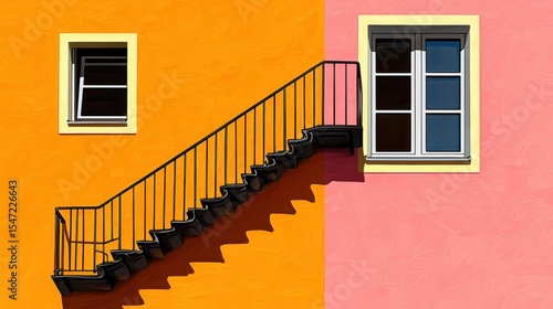 Black Metal Staircase Against a Bright Orange and Pink Wall