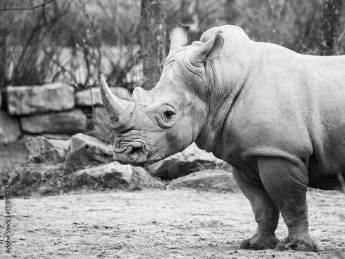 Black Rhinocero, Diceros bicornis, wild, dangerous and endangered african mammal in the ZOO. Black and white image.