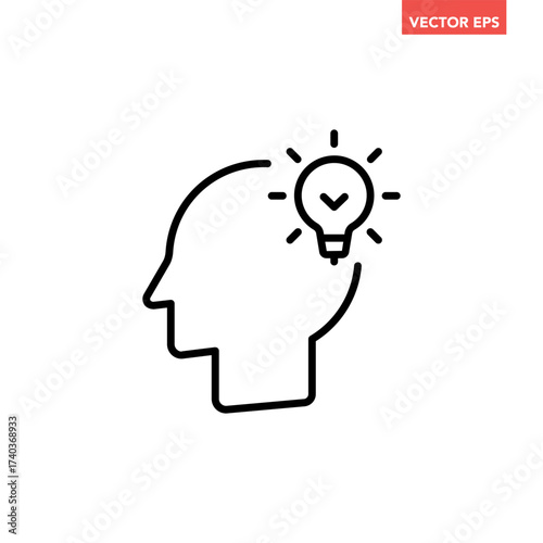 Black single head with bulb line icon, simple head thinking symbol flat design infographic pictogram vector for app logo ads web button ui ux interface elements isolated on white background